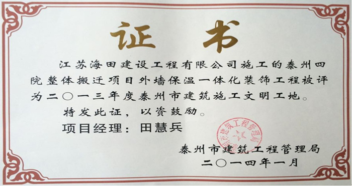 熱烈祝賀我公司承建的四人醫(yī)被評(píng)為“泰州市建筑施工文明工地”
